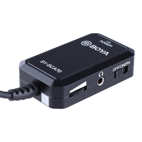 Wenn Sie mit professionellen Mikrofonen, Instrumenten oder anderen Audioquellen arbeiten, z. B. bei der Aufnahme eines Podcasts, können Sie mit dem BY-BCA70 das Audiomaterial auf ein Smartphone oder einen Computer übertragen. Das 6-Meter-Kabel ermöglicht Ihnen ein freies Arbeiten. Die Audioquelle wird automatisch vom Gerät erkannt, ohne dass Treiber installiert werden müssen. Die Audiodaten können mit praktisch jedem Programm, wie z. B. Audition, Audacity und Podcast-Apps, weitergegeben werden. Das BY-BCA70 verfügt über einen 3,5-mm-Anschluss für das Live-Hören mit Kopfhörern oder Ohrhörern (siehe optionales Zubehör). Die Lautstärke des Audiosignals kann mit dem Drehknopf am Gehäuse des BY-BCA70 von 0dB-30dB eingestellt werden.