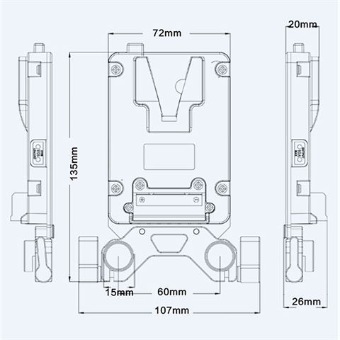 Der Rolux RL-AC13S ist ein Akkuhalter, der Ihre Kamera, LED-Leuchte oder Ihr Sound-Set mit Strom versorgt. Sie montieren den RL-AC13S an den universellen 15-mm-Kamerastangen (nicht im Lieferumfang enthalten), dank der beiden Löcher an der Unterseite. Sie legen dann einen Akku auf den RL-AC13S und die Stromversorgung erfolgt über zwei D-Tap-Anschlüsse. Die verfügbare Spannung hängt vom Akku ab. D-Tap ist ein universeller Standard, der für die Stromversorgung einer Vielzahl von professionellen Kameras und Zubehör verwendet wird. Zum optionalen Zubehör gehört ein empfohlener V-Mount-Akku und mehrere D-Tap-Kabel.