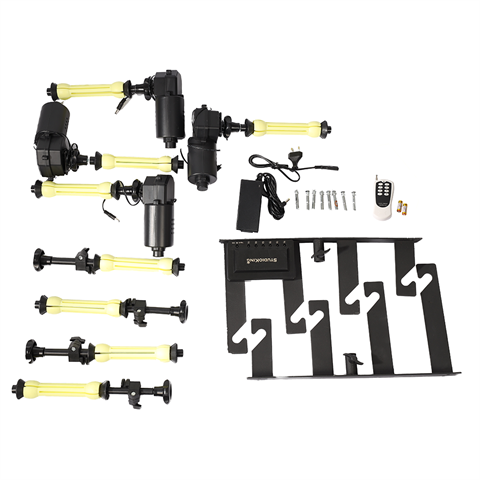 Du hängst das System an die Wand, an die Decke oder stellst es auf Stative. Dann hängst du die Rollen zwischen sie. An der Rollenhalterung sind Stromkabel befestigt, die du in den Controller an der Halterung einsteckst. Du musst nur den Motor einstecken und die Fernbedienung drücken. Mit der Fernbedienung wählst du aus, welche Rolle du anheben oder absenken möchtest. Die Fernbedienung funktioniert mit 2x 23A Batterien (12v). Ein sehr einfaches System also!